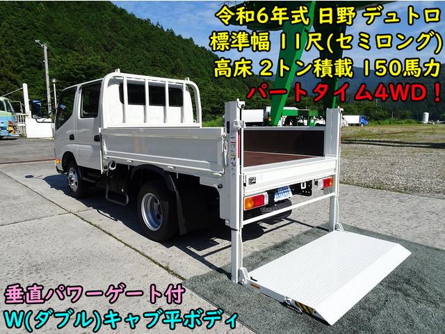 ★管理番号:L-13613 4WD! 日野 デュトロ Wキャブ(ダブルキャブ) 平ボディ 標準 セミロング 2トン積載 新明和工業 垂直パワーゲート付 昇降荷重600kg